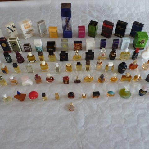140 parfymeminiaturer, nogle særligt sjældne og nummererede, 2 signeret af Armaldo Pomodoro, italiensk skulptør, forskellige mærker fra 1980'erne og 2000'erne.
