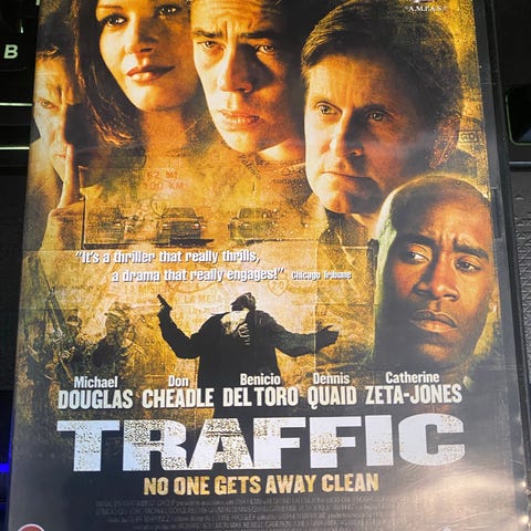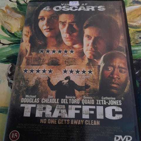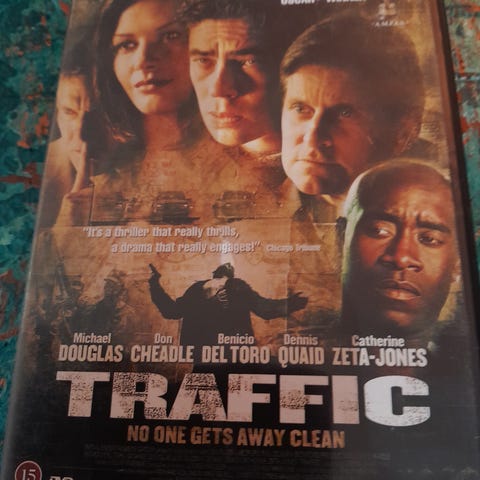 Traffic dvd film. Spillefilm i dvd-format med titlen "Traffic". Forsiden viser hovedrolleindehaverne og aldersmærkning 15 år. Velegnet til afspilning på dvd-afspillere, der understøtter standard dvd-video.