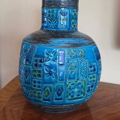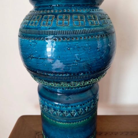 Keramikvase designet af Aldo Londi/Bitossi i Rimini Blu-motivet til Sardartist Castelsardo i 1960erne/1970erne; højde 12 cm, diameter 13 cm, vægt 620 g, blå, i fremragende stand. Klik på den blå "gå til varen" knap, for at købe eller byde på denne vare. Den samlede pris vil blive vist inden du afgiver dit bud.