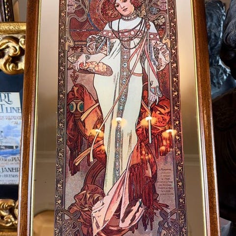Den feminine fremstilling minder om de dekorative figurer, der blev gjort populære af kunstnere som Alphonse Mucha, som var meget indflydelsesrig i denne periode.