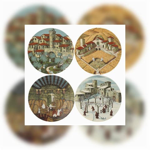 Fire smukke antikke fajance-tallerkener, smukt prydet med detaljerede, legende motiver fra det 19. århundrede.