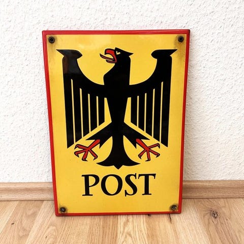 Bauhaus emailleskilt, fremstillet i Tyskland af stål og emalje, periode 1980–1990, original/officiel, 61 cm høj og 41 cm bred, tungt og i god brugt stand med mindre slidmærker. Klik på den blå "gå til varen" knap, for at købe eller byde på denne vare. Den samlede pris vil blive vist inden du afgiver dit bud.