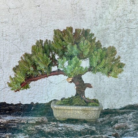 Til auktion tilbydes en raffineret Juniper bonsai (Juniperus) i mame-størrelse, en miniaturekomposition der udtrykker alder, styrke og naturlig karakter trods sine kompakte dimensioner.
