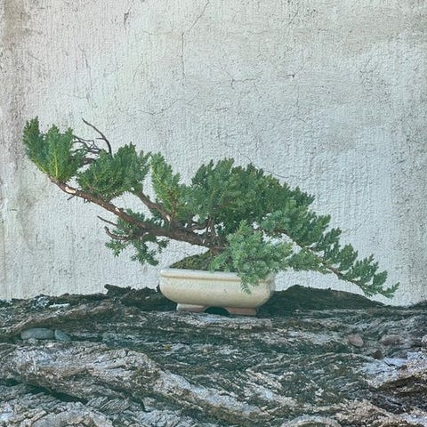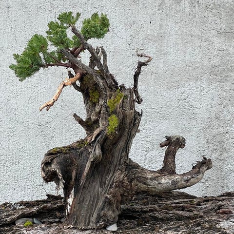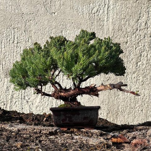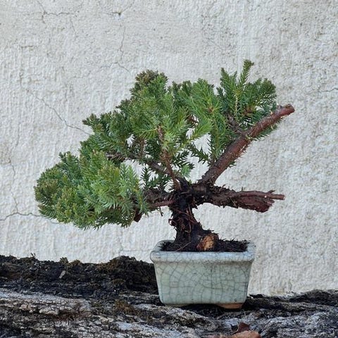 Til auktion tilbydes et enestående juniper-bonsai, en kompakt og forfinet shohin-størrelse komposition, der kombinerer styrke, elegance og moden karakter i en lille, men meget udtryksfuld form.