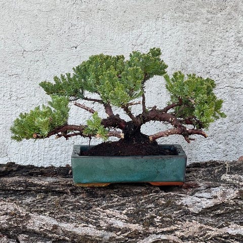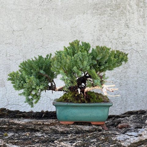 Enestående Juniper Bonsai – 4 cm stamme – kompakt Shohin – kraftfuld bevægelse – forfinet grøn glaseret potte