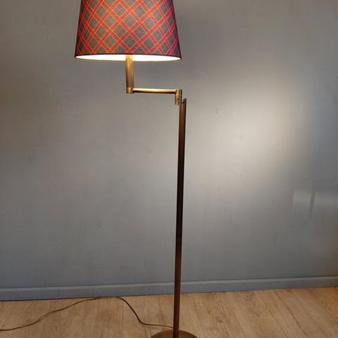 Gulvlampe med knæ-arm / svingarm. Denne klassiske lampe kan justeres efter ønske. Lampeskærmen kan ligge præcis i forlængelse af stangen, så den er en lodret lampe, men kan også svinges ud til ca. 50 cm og dreje 360 grader. Dette gør, at lampen nemt passer ved siden af forskellige typer skænke, stole, sofaer osv. Den nye fløjlsbrune lampeskærm giver et smukt spredt lys. Lampen er udstyret med en E27-fatning (normal fatning) og en af/til-træksafbryder ved fatningen (i ståhøjde) - se billederne for et godt indtryk.