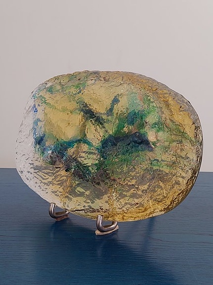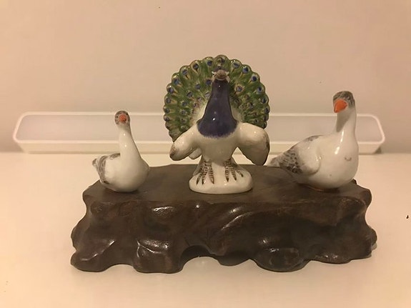Et grønt celadon-keramikvase med craquelé, fra 2000–2010, fremstillet i Kina, diameter 10 cm og højde 3,5 cm, vist på en mørk udskåret træfod. Klik på den blå "gå til varen" knap, for at købe eller byde på denne vare. Den samlede pris vil blive vist inden du afgiver dit bud.