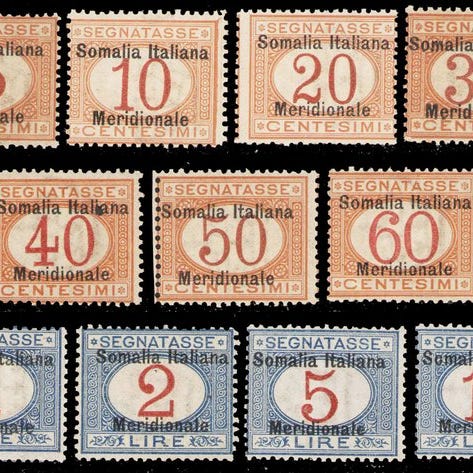 Italiensk Somalia, Pacchi Postali non emessi. Serie på 7 frimærker i kvartine, Sassone P43/49, fra 1926, mint uden kapsel, certificeret Raybaudi. Klik på den blå "gå til varen" knap, for at købe eller byde på denne vare. Den samlede pris vil blive vist inden du afgiver dit bud.
