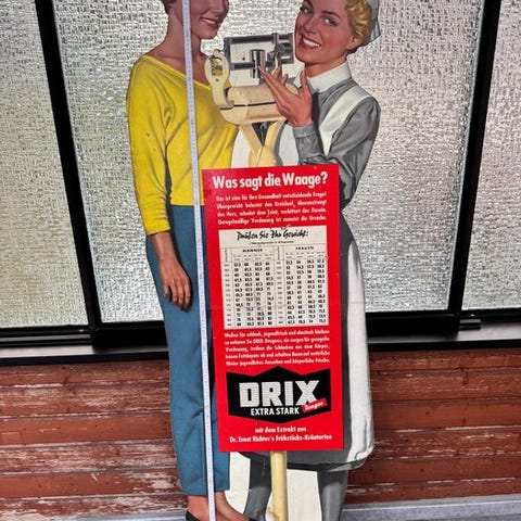 Originalt tysk apotekudstillingsstykke af Dr. H. Grunitz Nfg., Düsseldorf, dateret fra 1940-1950, i rimelig stand med kraftig slid og muligvis manglende dele, fremstillet af MDF/fibrboard, 80 cm høj og 60 cm bred. Klik på den blå "gå til varen" knap, for at købe eller byde på denne vare. Den samlede pris vil blive vist inden du afgiver dit bud.