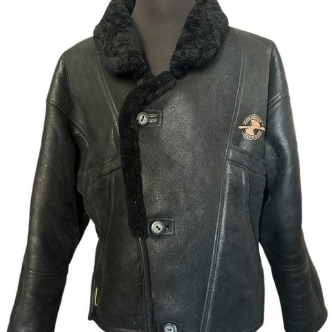 Læderet, tykt og holdbart, viser mange tegn på slid, ridser og naturlig patina, i overensstemmelse med alderen og brugen af plagget. Disse tegn bør ikke betragtes som defekter, men som et vidnesbyrd om dets autenticitet, hvilket gør hver detalje unik og uforlignelig. Den patinerede farve og de naturlige folder fortæller