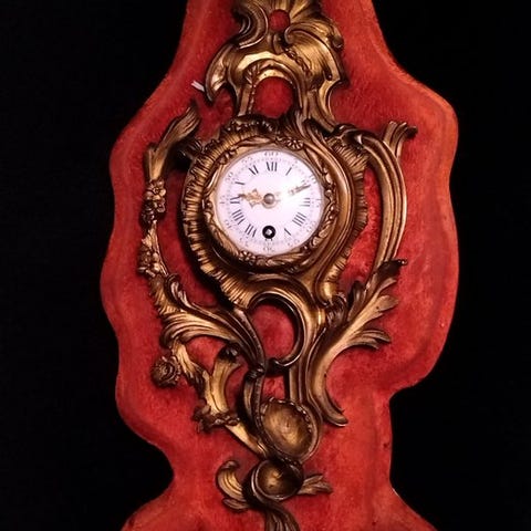 Klokken er lavet af udskåret og forgyldt træ, rigt dekoreret med elegante blomstermotiver. En velproportioneret og visuelt iøjnefaldende genstand, der passer til klassiske og traditionelle interiører.