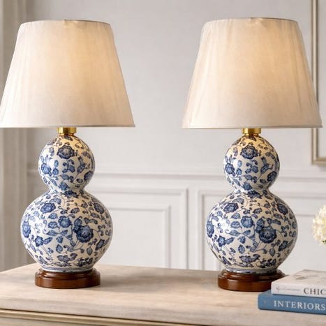 To Ralph Lauren Home Vintage Porcelain bordlamper af porcelæn på en mørk træfod, med klassisk gråt porcelæn, inklusive originalt forseglet stofskærm og messingsplakette. Velegnet til E27-pærer. Ubrugte og fuldt funktionsdygtige, i originalkassen.