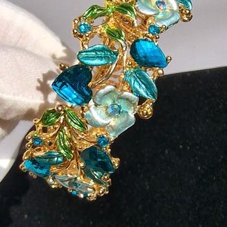 Dette klampe-armbånd er guldbelagt eller bronzebelagt og er indlagt med ovalformede polerede cabochons og firkantede blå og lilla krystaller.