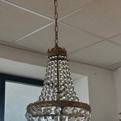 Empire-stil krystal-lysekroner (også kendt som sac-à-perles). Denne specifikke model kendetegnes ved sit ballonformede design med kæder af krystalperler, der samles i en metalring. Ringen er prydet med større, facetterede prismer.