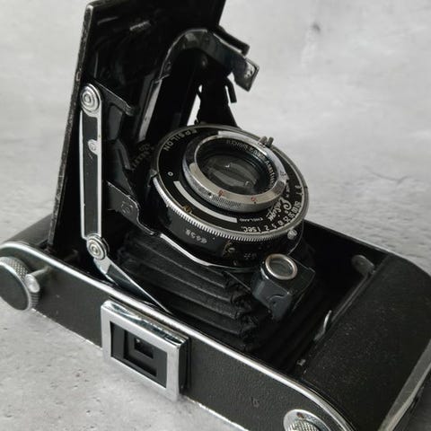 Foldkamera af mærket Kenngott Phoenix, tropisk model, størrelse 9x14, forgyldt.
