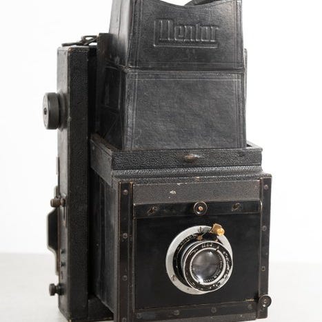 Kamera med metaldele forgyldt i guld og et brunt læderbellows: en luksusmodel.