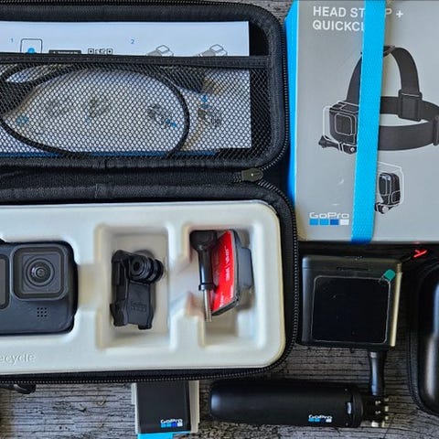 GoPro HERO10 Black actionkamera, testet og fungerer i god stand, fra 2021, komplet bundle med to originale GoPro-batterier, USB-laderkabel, hundeselemontering, klæbemontage, montagemslås og forlængelsesarme, 128 GB SanDisk Extreme microSD-kort med adapter, originalt hård etui, stort polstret bæretaske, rengøringsbørste og små tilbehør. Klik på den blå "gå til varen" knap, for at købe eller byde på denne vare. Den samlede pris vil blive vist inden du afgiver dit bud.