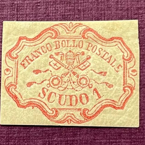 Pavelige Stater, Pontifikalet. Det pavelige våbenskjold, tiara og nøgler. 6 bajocchi, grå kant på bladets venstre side. I emissione ny med gummi og i perfekt bevaringsstand. Certifikat Manzoni.