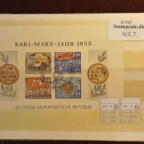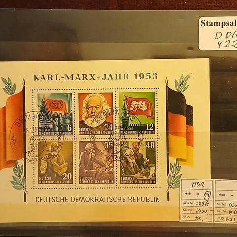 Komplet stempelsamling på fortrykte ark med alle gode udgaver og blokke, herunder også Debra-Block, Kineserne, alle 4 Marx-Blocke osv.