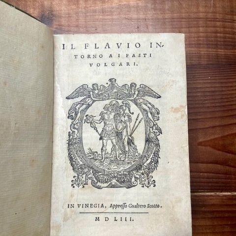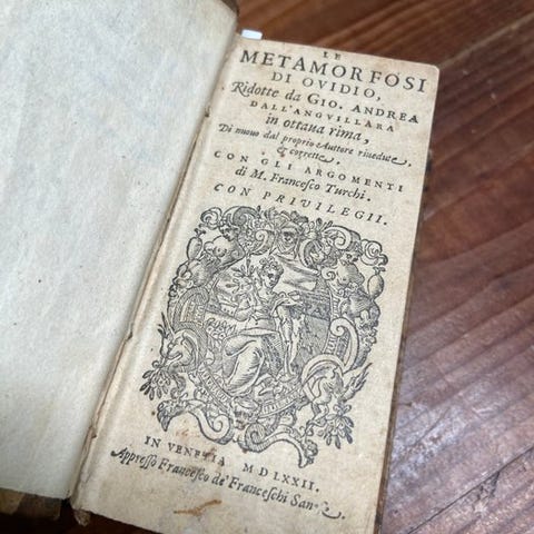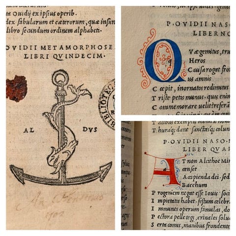 Smuk typografisk signatur ved frontispice og i bindet, og talrige kapitæler fint træsnitsede. Ex libris på første hvide ark og ejerskabsnotat ved første sarg. Frontispicio restaureret med papirmærke i den nedre halvdel og lille hul svarende til den sidste A i "Amatoria"; også det næste ark har forstærkning af papir