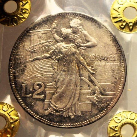 Italien, 2 lire mønt med spiga-design fra 1946 R, en del af den gamle møntudgivelse fra den Italienske Republik, ikke graderet. Klik på den blå "gå til varen" knap, for at købe eller byde på denne vare. Den samlede pris vil blive vist inden du afgiver dit bud.
