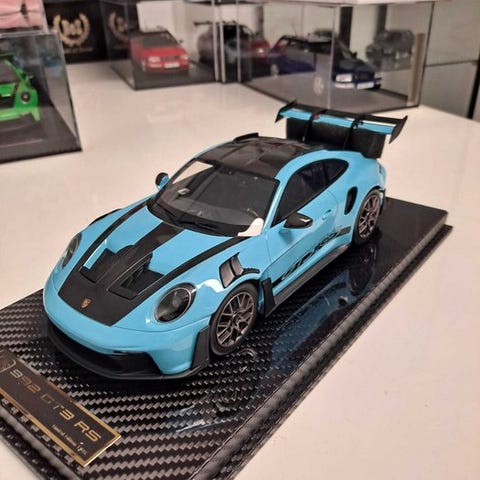 Radscale 1/18 Porsche 911-992 GT3 RS i sølv, støbt metal, ny, i originalt forseglet emballage, begrænset udgave på 46 stk, med luksusbund og vitrineskabe. Klik på den blå "gå til varen" knap, for at købe eller byde på denne vare. Den samlede pris vil blive vist inden du afgiver dit bud.