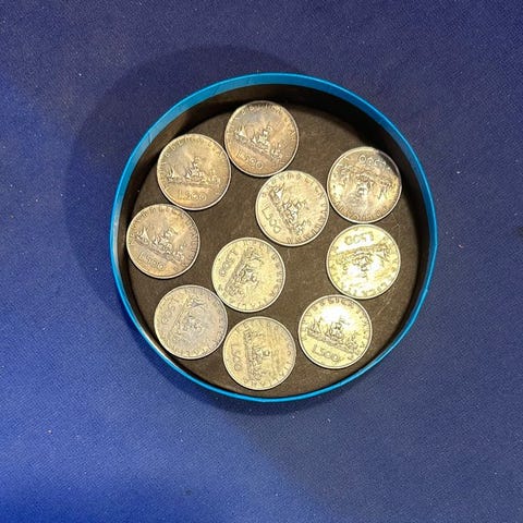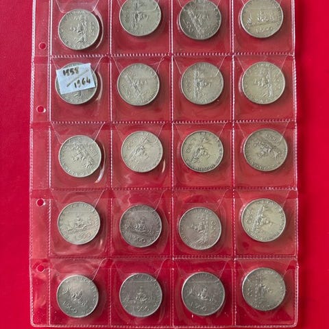 Fra privat samling foreslår jeg 27 mønter i sølv 835/1000. Gamle italienske mønter med forskellige datoer, nogle lidt slidte af tidens tand, andre i god stand. Inkluderer også en Kennedy half dollar fra 1964.