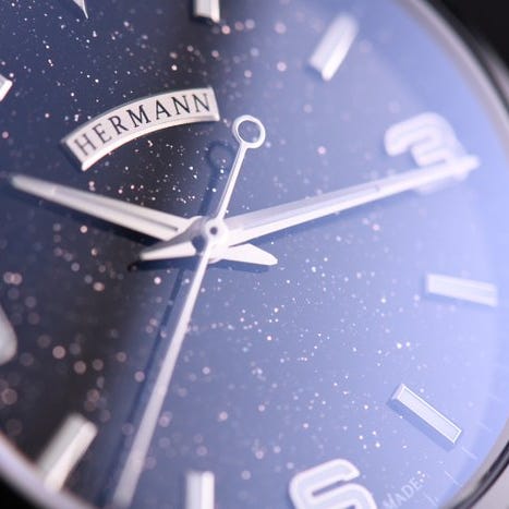 Dyk ned i elegancen af et sjældent ur med dette HERMANN-ur, der pryder en smuk aventurinorange urskive. Dette materiale glitrer i lyset som en stjernehimmel og giver enestående visuel dybde.