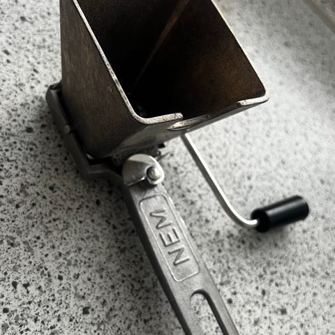 Persillekværn. Til at hakke persille, nødder og chokolade. Aluminium. Kan bruges til både høje og venstrehåndede da håndtaget også kan sættes i den anden side. Persillesovs.