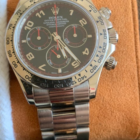 Rolex Oyster Perpetual Cosmograph Daytona, reference 116520, automatisk Calibre Rolex 4130 urværk, 40 mm rustfrit stål kasse, sort urskive, stålrem, herre, cirka 2002 (2000–2010), fuldt sæt med original boks, papirer og garanti. Klik på den blå "gå til varen" knap, for at købe eller byde på denne vare. Den samlede pris vil blive vist inden du afgiver dit bud.