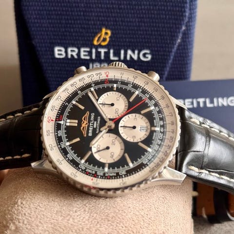 Uret Navitimer 41 GMT med kasse af rustfrit stål og læderrem. Brugt én gang. Afsendt som anbefalet med forsikring.