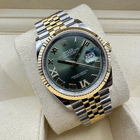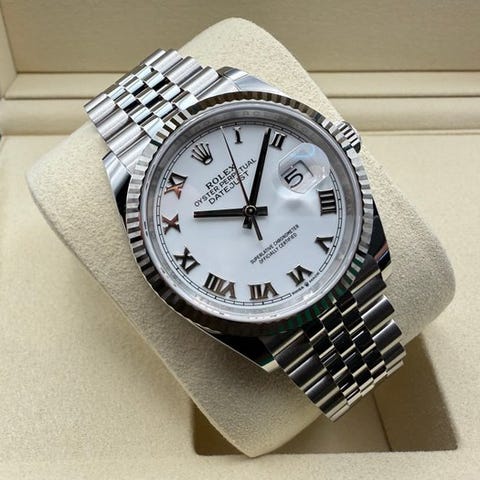 Tilgængelig nu er denne helt nye, ubrugt Rolex Datejust 36 fra januar 2026, Ref. 126200, der har den iøjnefaldende og elegante blå skive — en af de mest moderne og eftertragtede skivevarianter i Datejust-linjen.