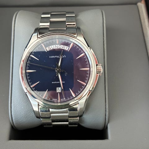 Referencenummer H38525811 Jazzmaster Thinline Auto med en 40 mm titanium stål kasse, champagne-farvet urskive, grøn læderrem, automatisk bevægelse, ny med original æske, papirer og garanti. Klik på den blå "gå til varen" knap, for at købe eller byde på denne vare. Den samlede pris vil blive vist inden du afgiver dit bud.