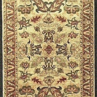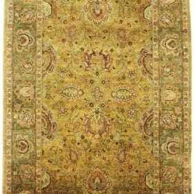Håndvævet orientalsk tæppe i uld, uden central medaillon med blomsterdekoration, på en beige og grøn baggrund. Rundt omkring en stor blomsterkant.