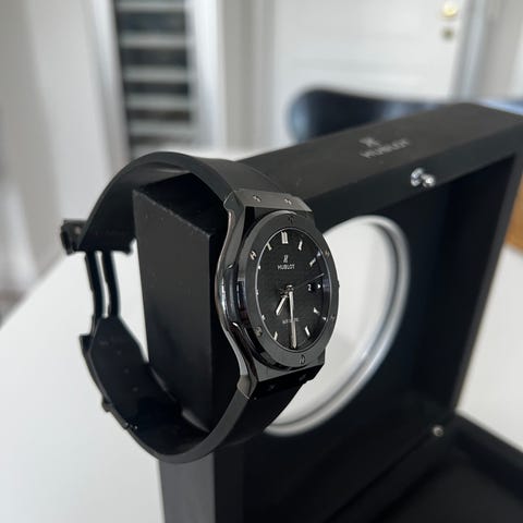 Hublot Classic Fusion Orlinski Blue Ceramic, reference 550.ES.5100.RX.ORL21, en sort herreur fra perioden efter 2020 med automatisk bevægelse, keramisk kasse på 41 mm, blå facetet urskive, blå gummirem, safirglas, vandtæthed 5 ATM, original trækasse i træ, originale papirer og garanti, drevet af HUB1100 (Sellita SW300-1a). Klik på den blå "gå til varen" knap, for at købe eller byde på denne vare. Den samlede pris vil blive vist inden du afgiver dit bud.