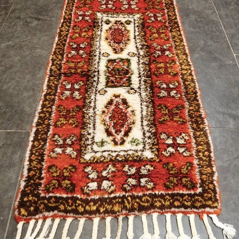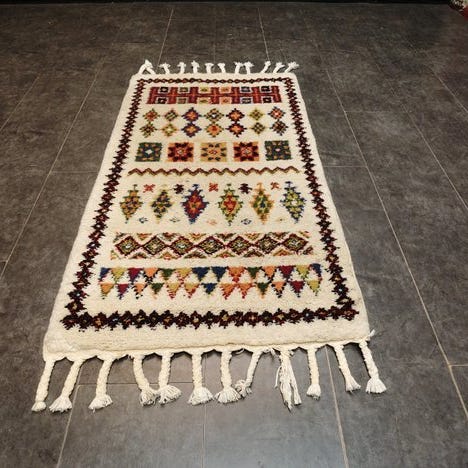 Oprindelse: Marokko; materiale: uld på bomuld; dimensioner: 242 × 162 cm; tilstand: generelt god; håndknyttet orientalsk tæppe med berber-typer oprindelse og ægthedscertifikat inkluderet. Klik på den blå "gå til varen" knap, for at købe eller byde på denne vare. Den samlede pris vil blive vist inden du afgiver dit bud.