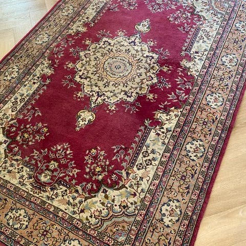 Tilbydes et håndknyttet orientteppe fra provinsen Kirman (Her: Indo Kirman).