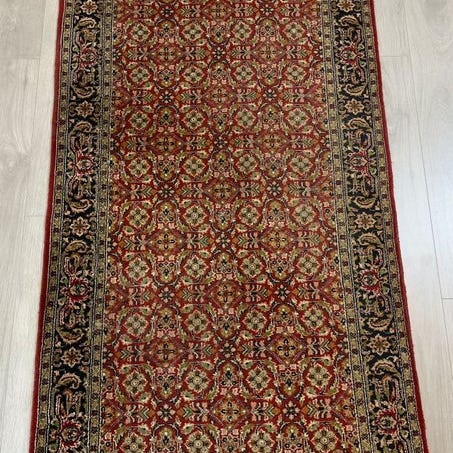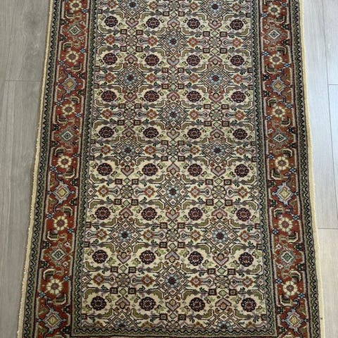 139 × 76 cm håndvævet orientalsk tæppe i Täbriz-design fra Indien, uld på bomuld, produceret i slutningen af det 20. århundrede, i god generel stand med tegn på alder og slid. Klik på den blå "gå til varen" knap, for at købe eller byde på denne vare. Den samlede pris vil blive vist inden du afgiver dit bud.