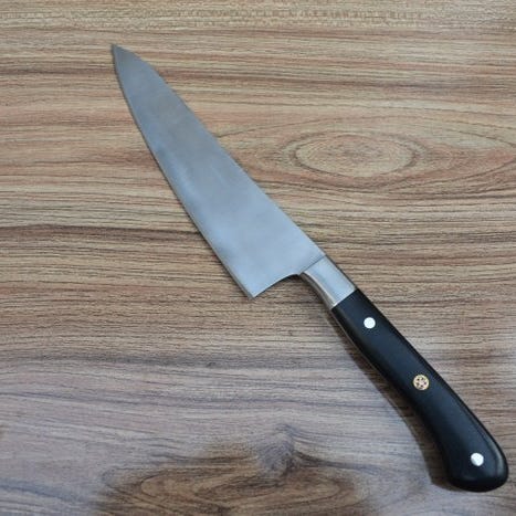 Dette omhyggeligt designede kokkekniv har en 8-tommer rustfri stålblade med Grantons-kanter for at minimere fastklæbning og forbedre præcisionen. Bladets sømløse design sikrer holdbarhed og professionel ydeevne til alle køkkenopgaver. Det 5-tommer håndlavede, ergonomiske håndtag giver et sikkert og behageligt greb, perfekt til længerevarende brug. Komplet med en premium læderskede til sikker opbevaring, kombinerer denne kniv funktionalitet, håndværk og elegance og er et uundværligt værktøj for enhver madentusiast.
