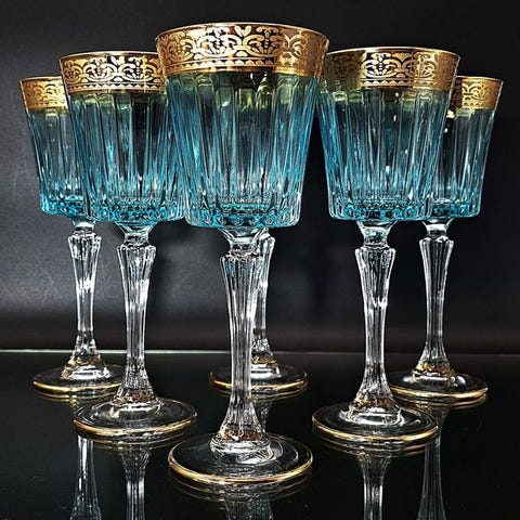 Pragtfuld og storslået kollektion af vinglas, unikke i deres slags. Imponerende og yderst elegante, med de smukke gulddekorationer. Små fejl, som man kunne finde, garanterer håndværket, ligesom de rige dekorationer skabt ved pantograf og ikke ved stempel gør denne kollektion endnu smukkere, hvor guldets ydre udvendigt tydeligt er oxideret og mørkner betydeligt, hvilket efter min mening gør dette sæt endnu mere unikt og eksklusivt.