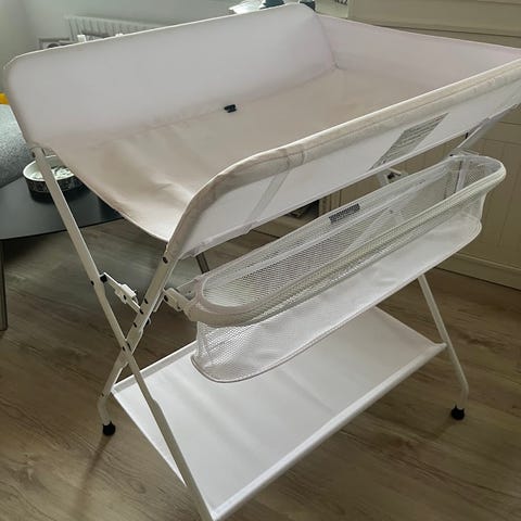 Jollyroom puslebord tilbehør i hvidt træ. Øverste del fungerer som pusleplads, og der er en hylde nederst til opbevaring af bleer.