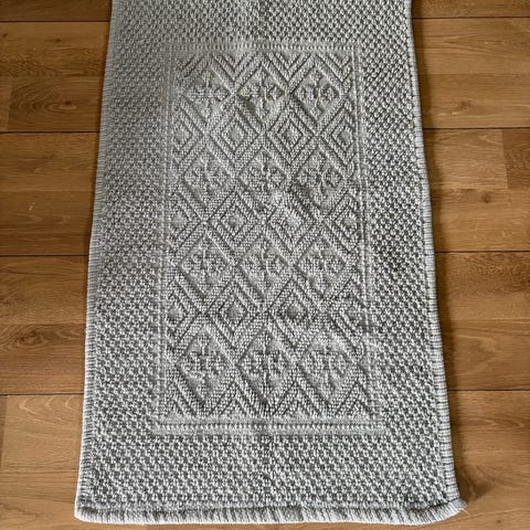 Grå skridsikker bademåtte i gummi. Måtten har perforeret mønster med små huller og forhøjede knopper, som giver afløb for vand og øget friktion mod underlaget. Velegnet til brug i brusekabine eller badekar for at mindske risiko for at glide på våde fliser. Kan rulles eller foldes sammen for opbevaring og rengøring.
