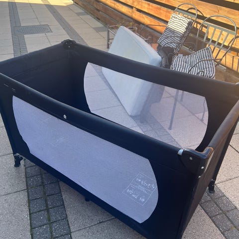 Bassin Baby rejseseng i sort. Sengen har netpaneler i siderne, som giver ventilation og mulighed for at holde øje med barnet. Den kan klappes sammen og opbevares i medfølgende transporttaske, hvilket gør den egnet til rejser og midlertidige sovepladser til mindre børn.
