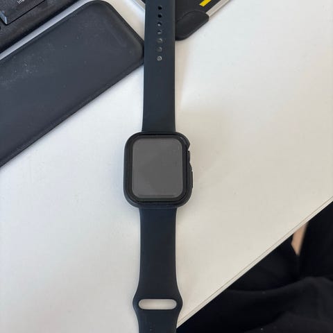 Apple Watch smartwatch unisex i sort. Uret har rektangulært display og sort sportsrem i silikone. Model SE gen2 44mm. Købt i august 2025, kvittering haves. Leveres med original Apple Watch-æske som vist på billederne. Ingen brugsspor og næsten ikke brugt.