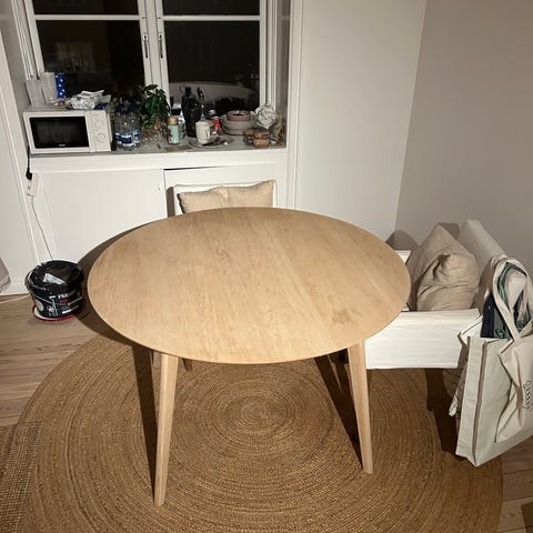 Brugt med tydelige brugsspor på bordpladen (se billeder). Der er ridser og enkelte mærker i overfladen, men bordet er stabilt og fungerer som det skal. Med en let slibning og evt. ny olie/lak kan det friskes pænt op.