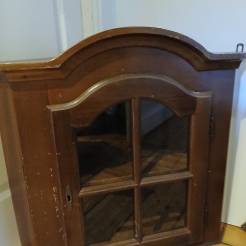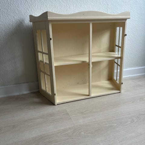 Vitrineskab med glaslåger i træ. Skabet har to glaslåger med flere glasfelter og indvendigt flere faste hylder. Ydersiden fremstår i lyst træ, mens indersiden er malet lys. Skabet står på udskårne ben i træ, hvoraf det ene er løst og skal repareres.