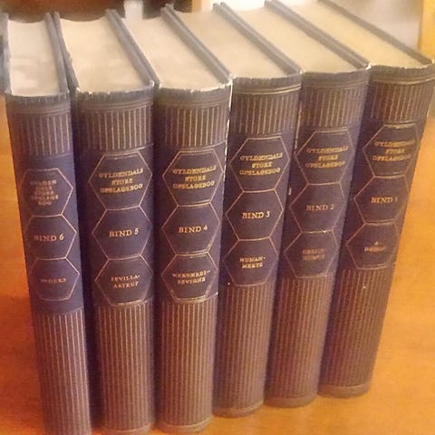 5 stk. pæne indbundne bøger, blå med guld skrift og guld på blade. Rigt illustreret med billeder samt tekst. Bind 1: A-D.