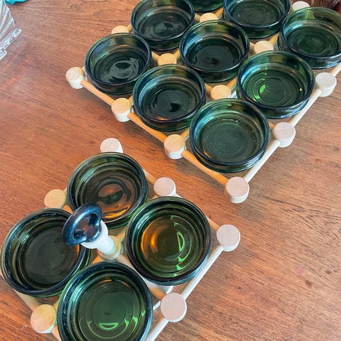 Cabaretfad, Nissen Denmark, Nissen cabaretfad karrusel. Retro karrusel i massiv egetræ med 5 grønne glasskåle.