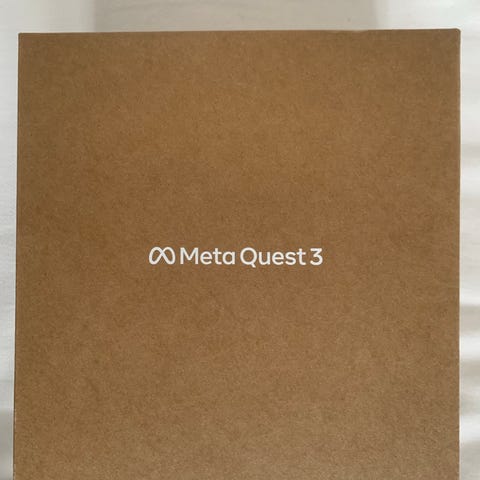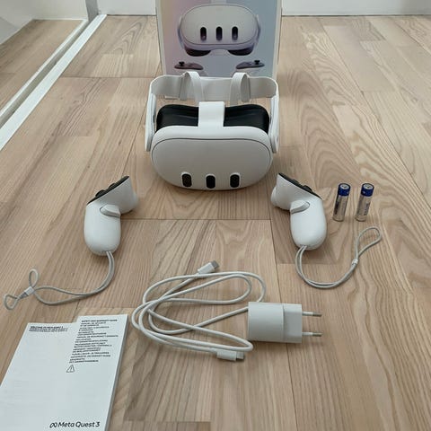 Meta Quest 3 VR-headset i hvid. Headsettet har integrerede sensorer på fronten og justerbar hovedrem. Sættet omfatter VR-headset, to trådløse controllere samt tilhørende kabler, som ses på billederne. Velegnet til trådløs virtual reality-brug med understøttede enheder og platforme.