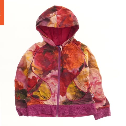 Mørkegrå trøje med lynlås og rødt zigzag mønster ved brystet. Den har lange ærmer og en høj krave. I blødt velour.
